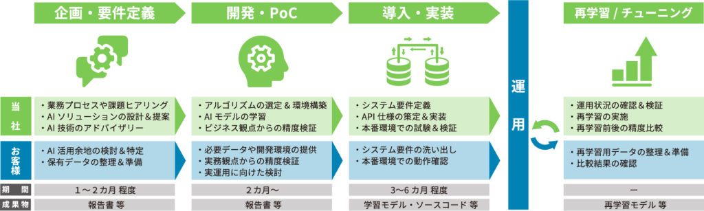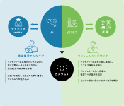 カスタムAIの開発・提供においては「機械学習エンジニア」と、当社独自のAIコンサルタント「ソリューションデザイナ」がお客様と共にプロジェクトチームを組み、AIによるイノベーション創出に取り組みます。