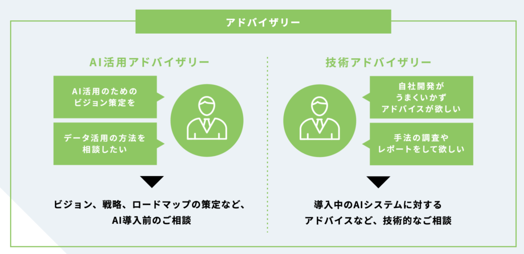 AI開発に先立つビジョンや戦略策定、導入ロードマップの策定、運用のためのコンサルティング支援などの「AI活用アドバイザリー」。
