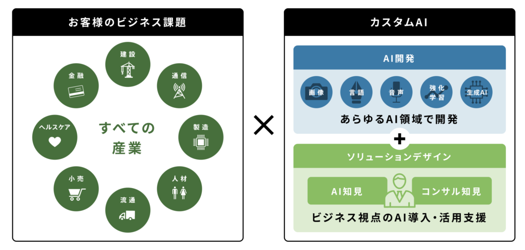 すべての産業、あらゆるAI領域で、ビジネス変革につながるAIソリューションをオーダーメイドで開発いたします。