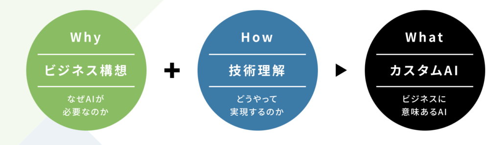 「ビジネス構想(Why)」の検討からお客様と協働し、「技術に対する深い理解(How)」を元に、「ビジネスに意味あるAI(What)」を開発・提供いたします。